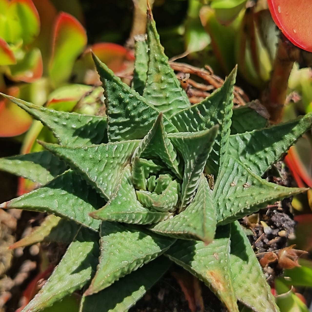 - Leaves are light to dark green, thick, and triangular with distinct transverse ridges of raised tubercles.